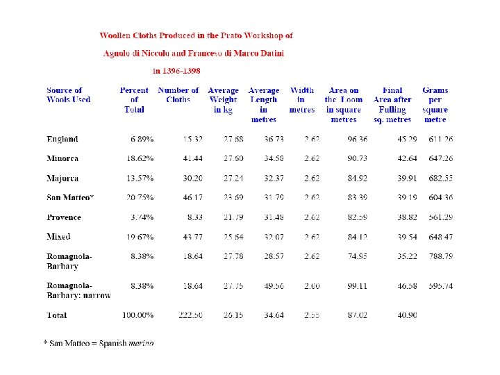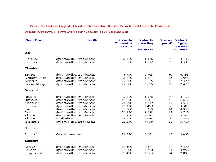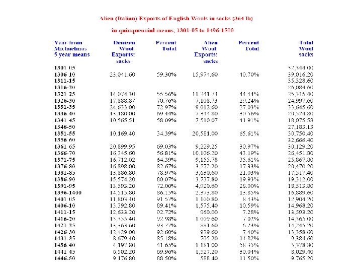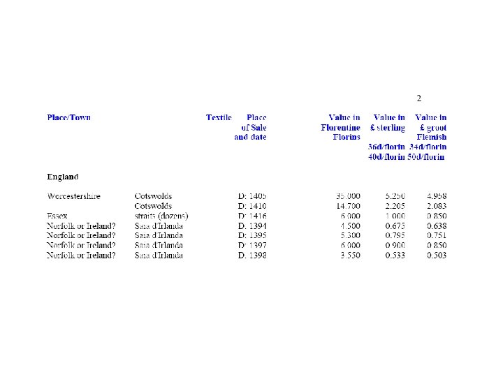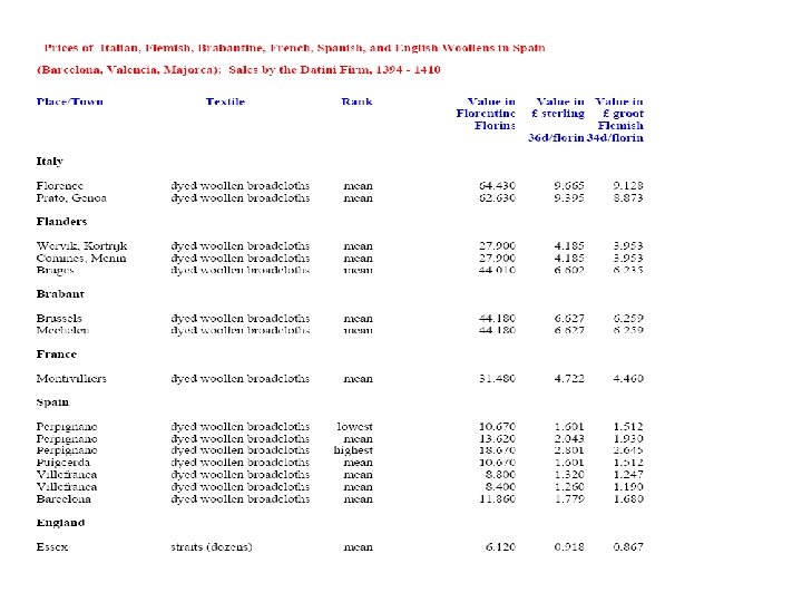Del Bene firm of Florence • In years 1355 to 1368, the Florentine merchant firm of the Del Bene imported English wools for the Arte della Lana: • 145, 985 lb. Florentine = 49, 568 kg. • 80% came from the three major regions: • - Cotswolds: 46. 03% • - Welsh Marches (Shropshire): 25. 73% • - Lincolnshire: Lindseys: 7. 29%