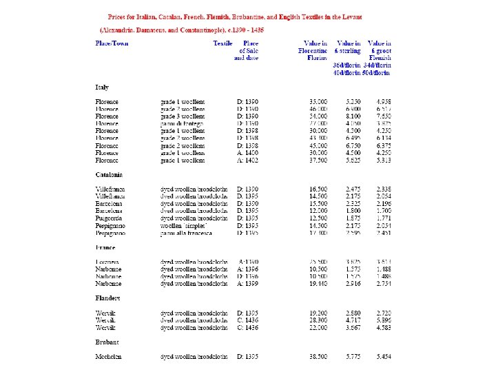 The Golden Age of the Arte della Lana: 1330 s to 1370 s - 4 • 5) Florentine Supremacy in Mediterranean Markets: and with increasingly higher cloth prices • a) Pisa: 1354 -1371: mean price = 43. 55 florins = £ 6. 50 st; highest: 115 fl. = £ 17. 25 st • b) Catalonia: 1390 s: mean price = 64. 43 florin = £ 9. 67 sterling (Florentine = 27% of total Datini sales) • c) Syria & Egypt: 1390 s: 35 - 54 florins = £ 5. 25 - £ 8. 10 ster. , • - vs. Flemish woollens: 38. 5 florins for Mechelen woollens and 19. 2 florins for Wervik woollens (Nouvelles Draperies) • d) Poland in 1390 s: Florentine woollens at 32 florins = £ 4. 81 sterling (shorter) vs. 43. 5 florins for Bruges woollens and 46. 67 florins for Brussels woollens (£ 7. 00 sterling = 280 days’ wages for an Oxford master mason)