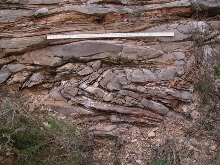 grey patina (result of last 30 years since road-cut was made) black color of fresh rock Note laminae that pinch out – evidence for bottom currents (hyperpycnal flow)