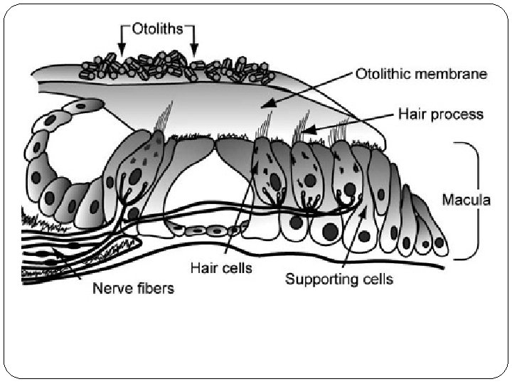 Balance Dynamic Equilibrium – required when the body is moving Fluid in the semicircular canals causes bending of the hair cells which generates a nerve impulse which travel to the temporal lobe of the brain Continuous movement causes motion sickness Static Equilibrium – required when the head or body move horizontally or vertically Otoliths in vestibule of utricle and saccule are displace by gravity The otoliths come in contact with the hair cells bending them which generates a nerve impulse which travels to the temporal lobe of the brain