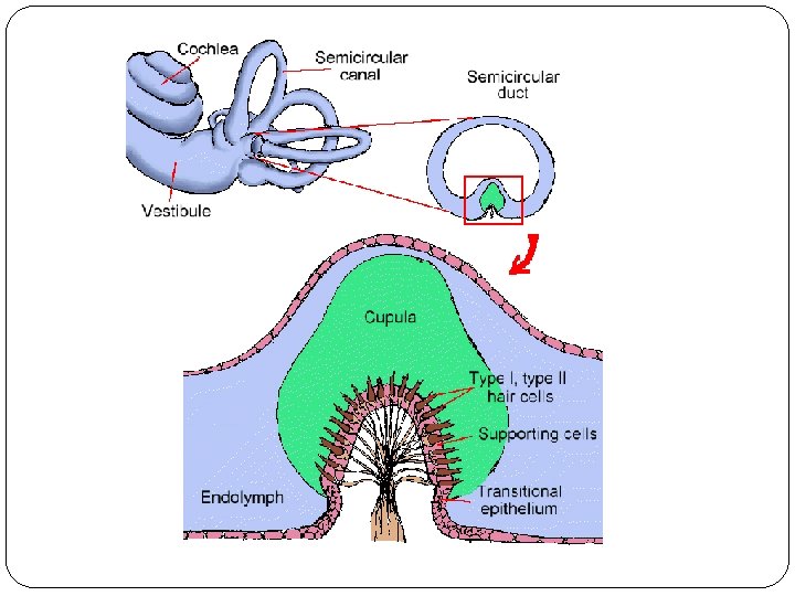 Inner Ear – Balance: Semicircular Canals Arranged in all three dimensions of space Base of each canal has hair cells with cilia Provide a sense of balance (dynamic balance – 3 D motion) Vestibule A chamber between the semicircular canals and cochlea Contain two membrane sacs: Utricle and Saccule static balance, when you move your head Both contain hair cells with cilia protruding into a gelatinous material that has otoliths (calcium carbonate particles)