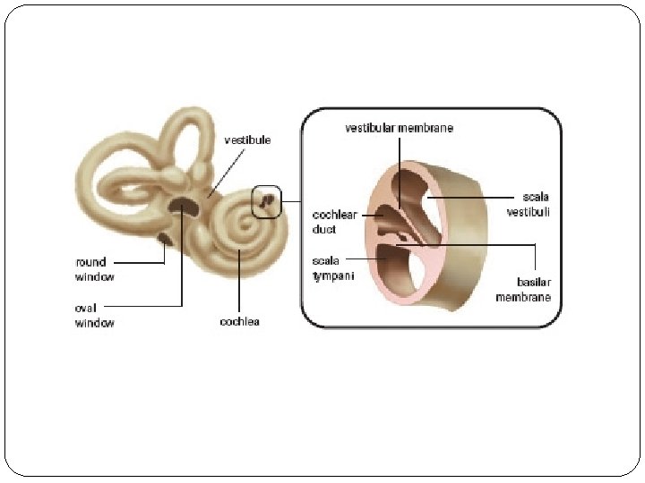 Inner Ear - Hearing: Cochlea - coiled structure of the inner ear, responds to various sound waves and converts them to nerve impulses Oval Window – receives vibrations from the ossicles (specifically stapes) Round Window – absorbs the sound wave Organ of Corti – primary sound receptor in the cochlea (hair cells in cochlea and neurons they’re attached to) Nerve impulse travels from the auditory nerve to the temporal lobe and are interpreted as sound.