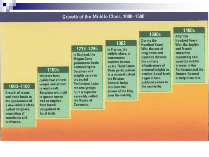 Revival of Trade/Towns URise of bourgeoisie (middle class) UNew economic class grew with: UIncreased trade UGrowth of towns UConsisted of professional people: UMerchants UShopkeepers UBankers