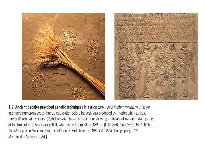 Humans Have Been Using Genetics for Thousands of Years Ø Although the science of genetics is young —almost entirely a product of the past 100 years or so—people have been using genetic principles for thousands of years. 1. 1 The Early Use and Understanding of Heredity § The first evidence that people understood and applied the principles of heredity in earlier times is found in the domestication of plants and animals, which began between approximately 10, 000 and 12, 000 years ago in the Middle East. § The first domesticated organisms included wheat, peas, lentils, barley, dogs, goats, and sheep. By 4000 years ago, sophisticated genetic techniques were already in use in the Middle East.