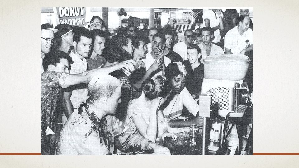 THE MOVEMENT SPREADS • Greensboro Sit-In at Woolworth’s on Feb 1, 1960 • 4 black college students from UNC A&T -Greensboro decided eat at White Only diner Woolworth’s • Were denied service, but sat at counter until closing • 2 nd day, returned with dozens of supporters • 3 rd day, students occupied 63 of 65 counter seats • 4 th day, 3 white women join the sit in • Economic boycott results, White business leaders cave to pressure. On July 25, 1960, first African American eats at Woolworth’s