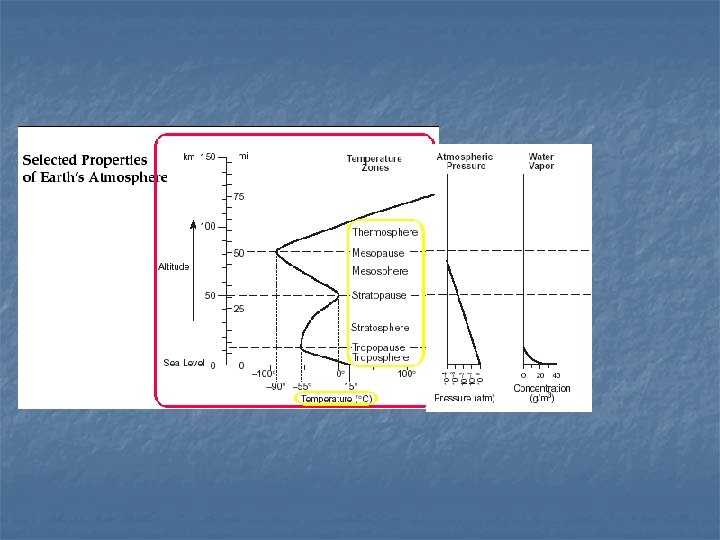 ESRT Question on Atmosphere n In what layer of the atmosphere is the temperature at it’s lowest? n As you increase in altitude from sea level, what happens to the atmospheric pressure? n What is the temperature at the tropopause?