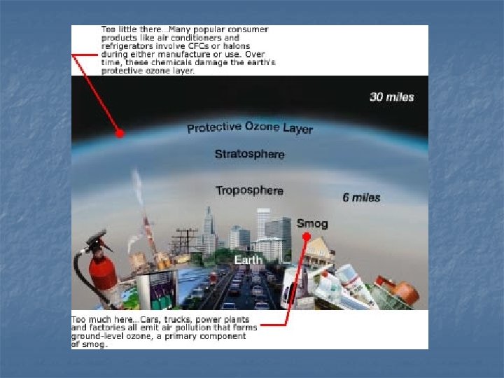 Ø Ø The ozone layer is being reduced by human emissions of chlorine and fluorine, creating “Ozone Holes”. Top Image 2000 and Bottom Image 2006