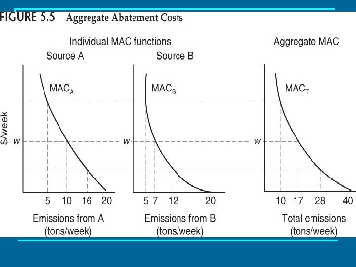 Aggregate Marginal Abatement Costs n The aggregate marginal abatement cost curve is a summation, or aggregation, of individual relationships. q The total cost will depend on how the total emissions are allocated among the different sources. n n Add together the individual functions to yield the lowest possible aggregate marginal abatement costs. The way to do this is to add them horizontally.