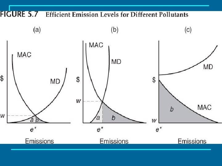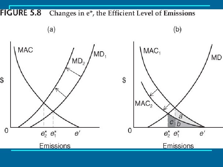 Changes In the Efficient Level of Emissions n n The level of emissions that was efficient last year, or last decade, is not necessarily the level that is efficient today or that is likely to be in the future. When any of the factors that lie behind the marginal damage and marginal abatement cost functions change, the functions will shift and e* will change.