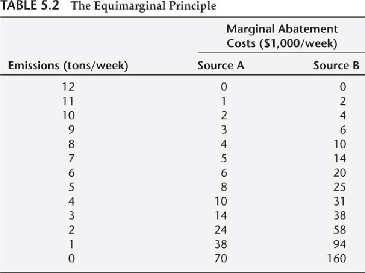 Equimarginal Principle n n In effect what we have done here is to invoke the important equimarginal principle. To get the minimum aggregate marginal abatement cost curve, the aggregate level of emissions must be distributed among the different sources in such a way that they all have the same marginal abatement costs.
