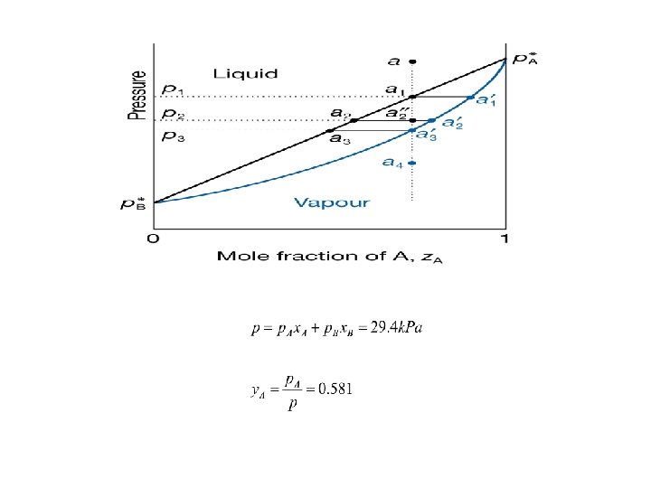 Q. One mole of benzene is mixed with two moles of toluene. At 60 C , the vapor pressure of benzene and toluene are 51. 3 and 18. 5 k. Pa, respectively. (a) As the pressure is reduced, at what pressure will boiling begin? (b) What will be the composition of the first bubble of vapor?