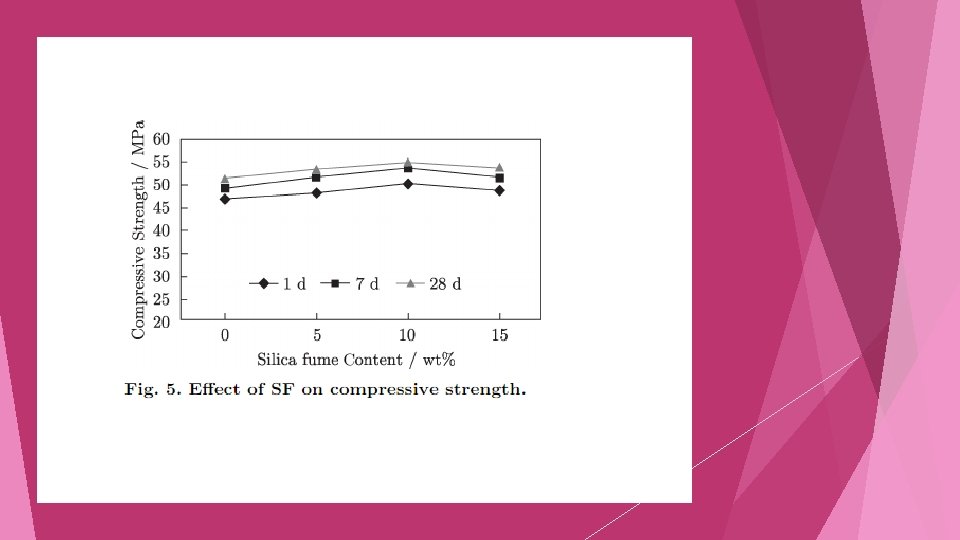 5 -Compressive Strength Silica fume is generally known to improve the mechani-cal properties of concrete. The silica fume particles with small size and sphericalshape can fill the voids created by free water in the matrix. Concrete made with silica fume follows the conventional relationship between compressive strength and w/c but strength is increased at a given w/c ratio when silica fume is used.