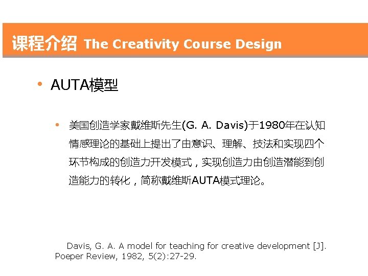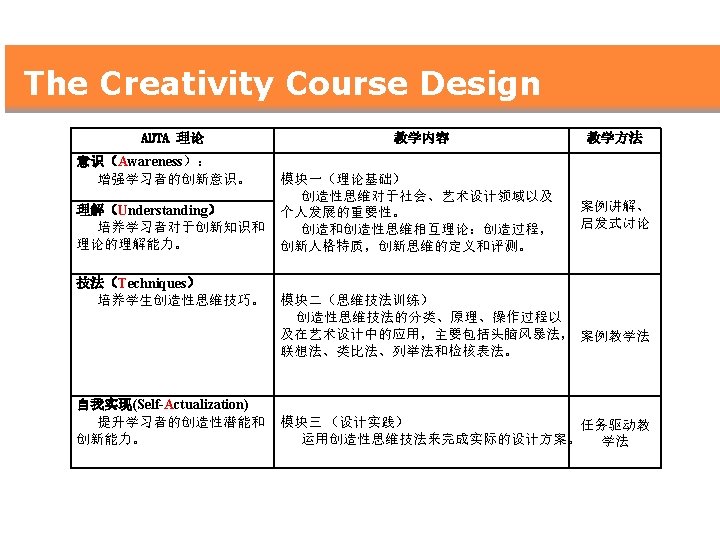 研究目的 Research Purpose l 调查研究创新能力培养课程教学的有效性 The purpose of this study is to investigate the overall effectiveness of a creativity course in developing creative thinking in Chinese university design students.