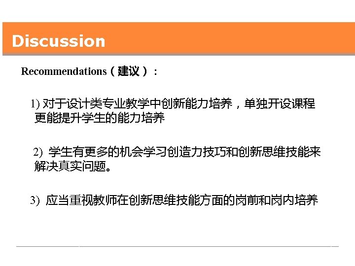 Discussion Conclusion : 一个学期的创新能力培养课程的确对于学 生能力的提升有一定作用! The one-semester creativity training course in this study did work to increase design students’ creative thinking levels.
