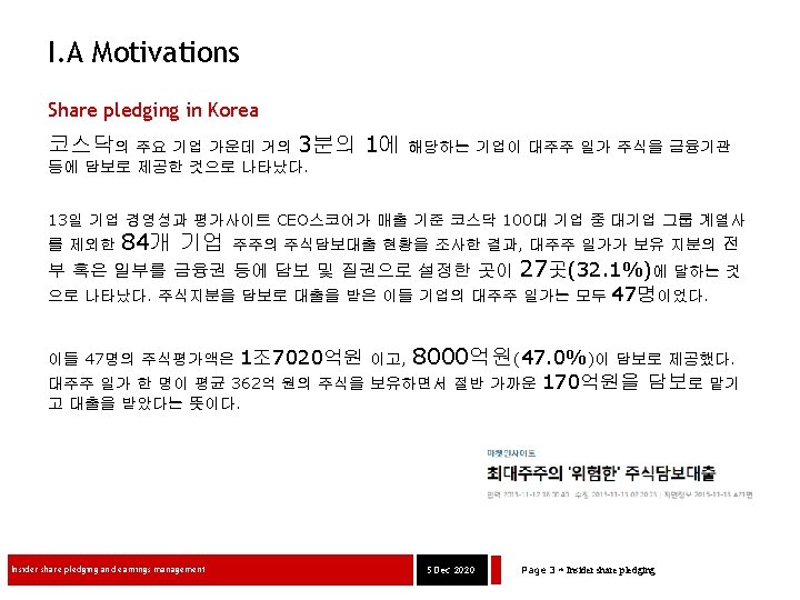 I. A Motivations Share pledging in Korea Insider share pledging and earnings management 5 Dec 2020 Page 2 Insider share pledging