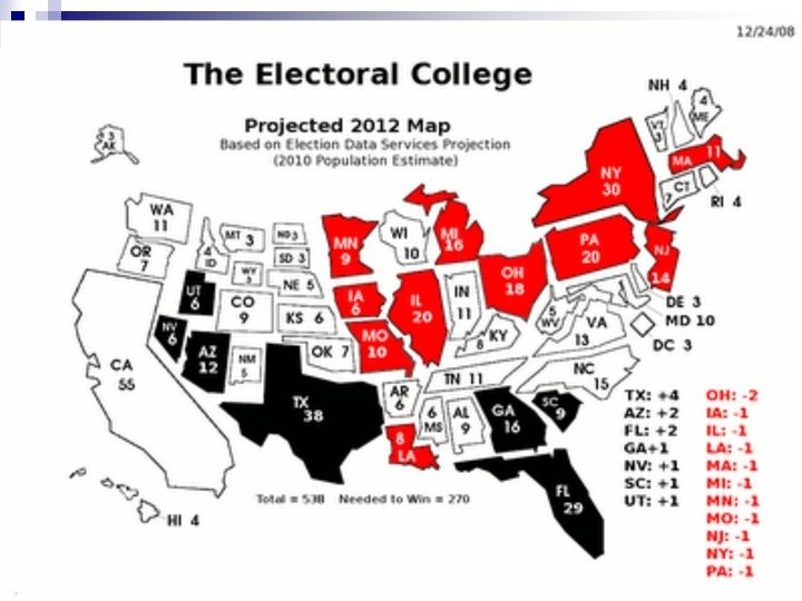 How it works cont’… n n n On the Monday following the second Wednesday of December, each state's Electors meet in their respective state capitals and cast their electoral votes - one each for president. A joint session of congress is held to tally the electoral votes. A candidate needs 270 electoral votes to be declared the winner. ¨ n n n Where does this number come from? There are 435 Representatives in the house and 100 senators in the senate, plus 3 electors in the District of Colombia…add em up 538 - Then divide by 2. . . . = 269 + 1 vote = simple majority