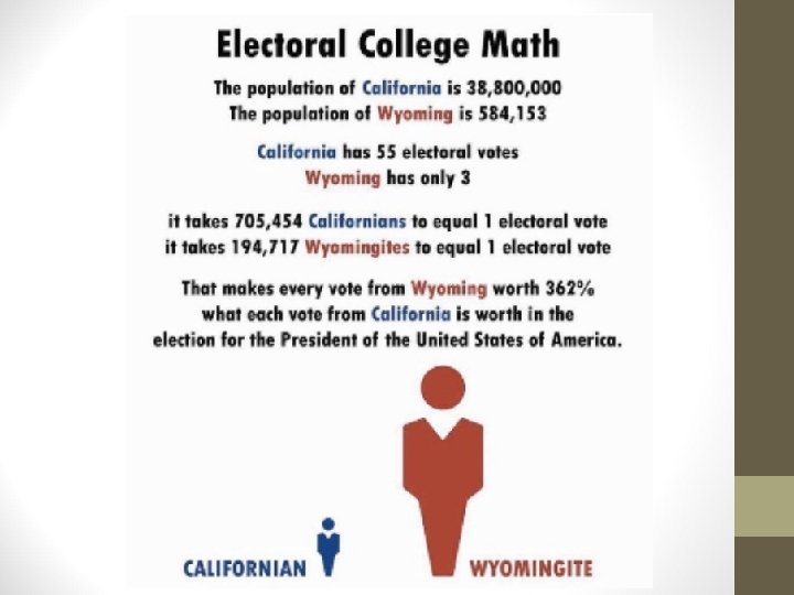 Flaws in the Electoral College • The least populous state – Wyoming, with 586, 107 residents – gets three Electoral College votes • The most populous state – California, with 39, 144, 818 residents – gets 55 Electoral College votes • How disproportionate is that? • In the Electoral College, each individual Wyoming vote weighs 3. 6 times more than an individual Californian’s vote • Wyoming receives one electoral vote for every 195 k people • California receives one electoral vote for every 711 k people • How powerful is your vote?