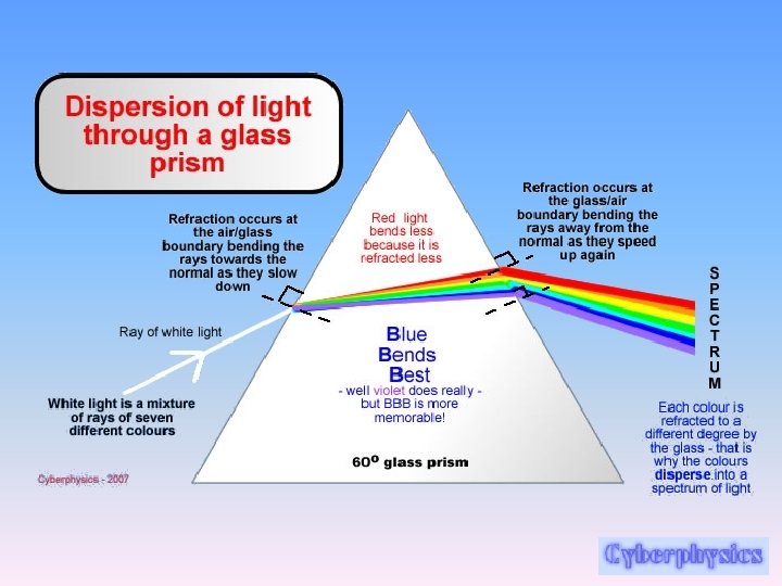 • When electromagnetic rays travel through a medium (such as light travelling through glass) interaction with the particles in the glass delays the energy transfer and the speed is slower. • This results in refraction. • Higher energy photons are slowed down more than lower energy ones and therefore refract more.