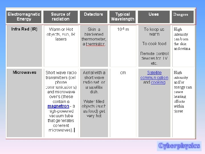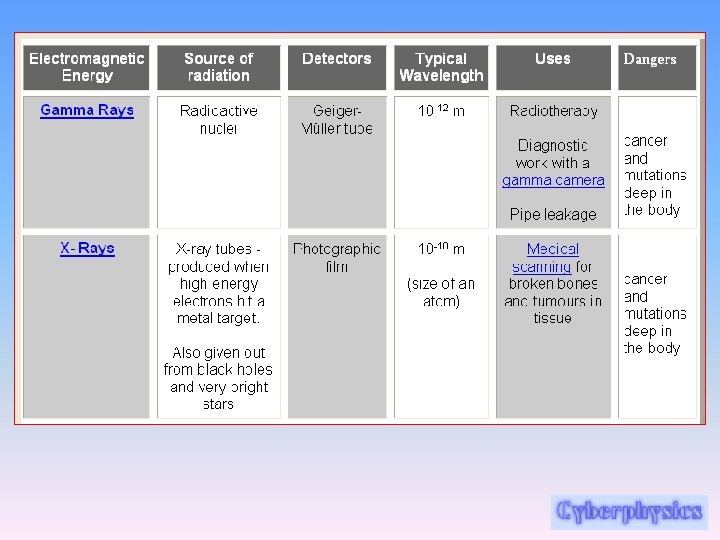 • You have to know the uses and dangers of all of the parts of the electromagnetic spectrum. • Here is a table that lists these in an easy to learn format. • If you look at this table on Cyberphysics you will find links to pages that give you more detail – but this is what you need to learn.