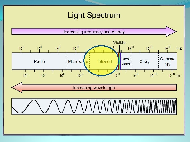 Infrared waves �Near infrared waves are used in TV remotes �Far infrared waves are what you feel when you feel heat from any source (oven, body heat) �We can’t see this with our eyes, but we have devices that can. (the previous colorful pictures) �Range from 1 cm to 1µm (1/100000 th of a m) �the size of cells