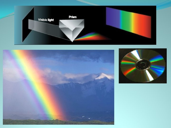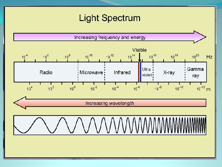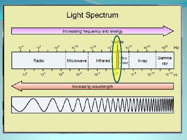 Visible light waves �These waves can be perceived by our eyes �They come in 7 colors, red, orange, yellow, green, blue, indigo, & purple �If you are looking at something green, the object is absorbing all 6 wavelengths, but bouncing back the green wavelength into your eyes. �Range from 700 nm to 400 nm (nanometer is 1 billionth of a meter!) �size of viruses, tinier than cells