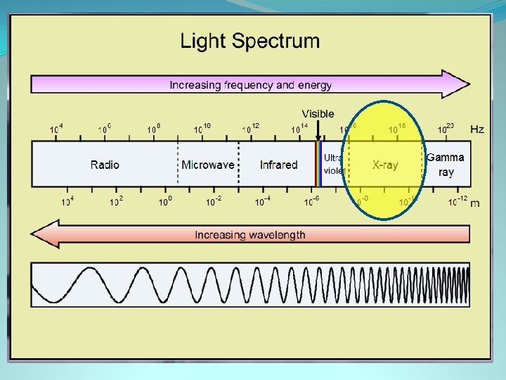 X rays �Given off by many space objects but �Earth’s atmosphere blocks them �Commonly used in medical situations �When something is heated to over a million degrees then x rays would be given off �Range in size from 10 nm to. 01 nm �the size of atoms