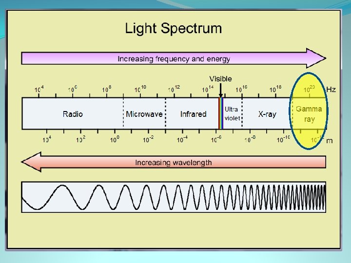Gamma rays �Can’t see or feel these, but would cause great damage �Tiniest wavelength �Greatest energy of all waves �A collapsing star (hypernova) can create these, making more energy than the sun’s entire lifetime �Also generated by radioactive atoms and nuclear explosions �Range in size from. 01 nm to. 000001 nm �tinier than the nucleus of an atom