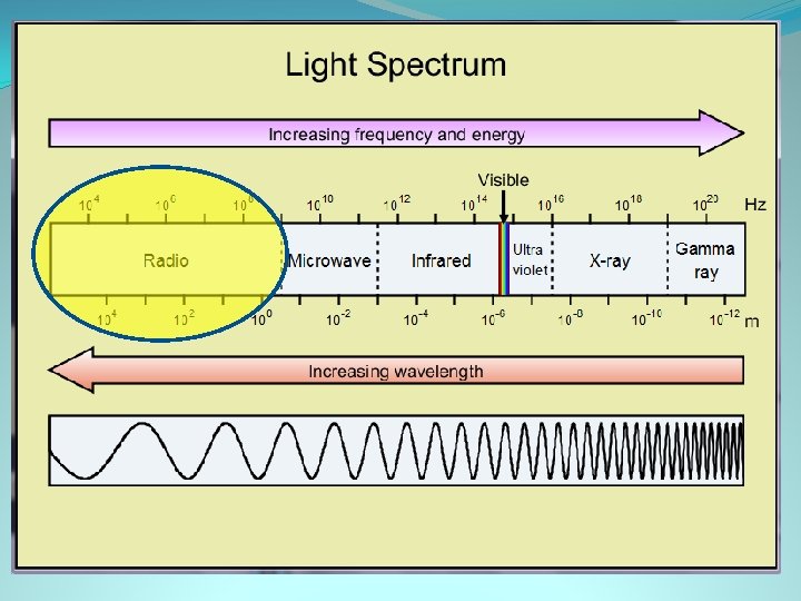 Radio waves �Can transfer energy such as music over long distances �Largest wavelengths �Range from 1 meter to 1000 meters long �The size human up to the size of a building �Lowest energy waves �FM station 88. 1 (MHtz) is 88, 100, 000 (Htz) which calculates out to 3. 4 meters long each �AM station 1600 has 187 m long wavelengths