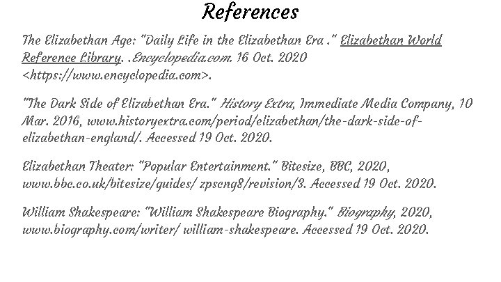 References The Elizabethan Age: "Daily Life in the Elizabethan Era. " Elizabethan World Reference Library. . Encyclopedia. com. 16 Oct. 2020 <https: //www. encyclopedia. com>. "The Dark Side of Elizabethan Era. " History Extra, Immediate Media Company, 10 Mar. 2016, www. historyextra. com/period/elizabethan/the-dark-side-ofelizabethan-england/. Accessed 19 Oct. 2020. Elizabethan Theater: "Popular Entertainment. " Bitesize, BBC, 2020, www. bbc. co. uk/bitesize/guides/ zpscng 8/revision/3. Accessed 19 Oct. 2020. William Shakespeare: "William Shakespeare Biography. " Biography, 2020, www. biography. com/writer/ william-shakespeare. Accessed 19 Oct. 2020.