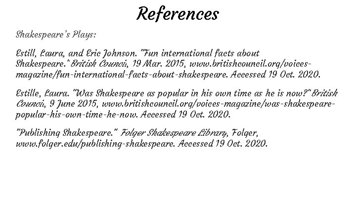 References Shakespeare’s Plays: Estill, Laura, and Eric Johnson. "Fun international facts about Shakespeare. "British Council, 19 Mar. 2015, www. britishcouncil. org/voicesmagazine/fun-international-facts-about-shakespeare. Accessed 19 Oct. 2020. Estille, Laura. "Was Shakespeare as popular in his own time as he is now? "British Council, 9 June 2015, www. britishcouncil. org/voices-magazine/was-shakespearepopular-his-own-time-he-now. Accessed 19 Oct. 2020. "Publishing Shakespeare. " Folger Shakespeare Library, Folger, www. folger. edu/publishing-shakespeare. Accessed 19 Oct. 2020.