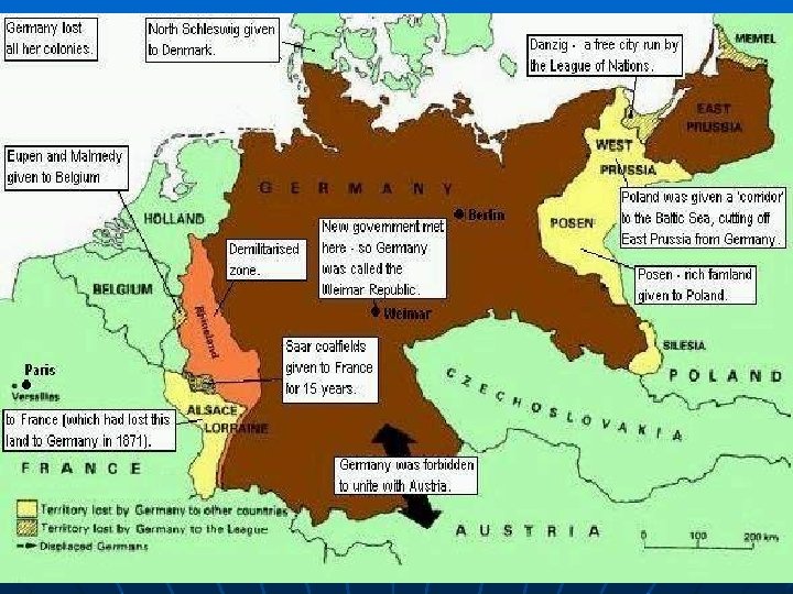 Territories: § Germany was to lose all her past conquests. § § These were to be returned to their own national units. Alsace and Lorraine were returned to France. The Saar, the coal-producing area of Germany, was brought under the control of the League of Nations for 15 years. Eupen and Malmedy were given to Belgium. In the north, North Schleswig was returned to Denmark.