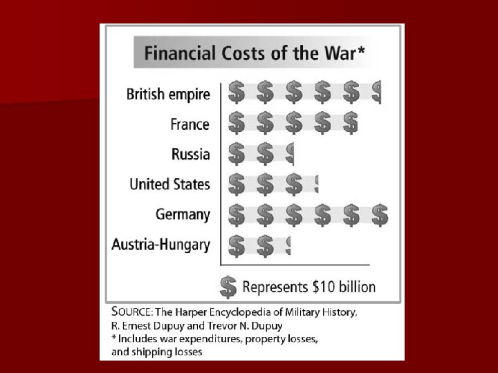 Overview: Ø 10 million dead (estimate) Ø ● The economy of Europe devastated. Ø ● The concept of “total war” was accepted. Ø ● Europe was deprived of world hegemony. The US became the most powerful nation in the world. Ø ● Western civilization was demoralized.