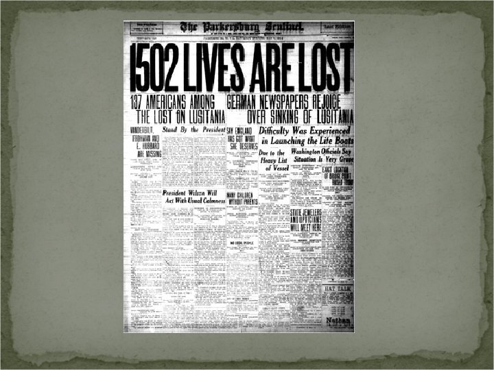 · In 1915, a German submarine torpedoed the Lusitania, a British passenger ship, killing approximately 1, 200 people, 10/02/10 including 128 Americans.