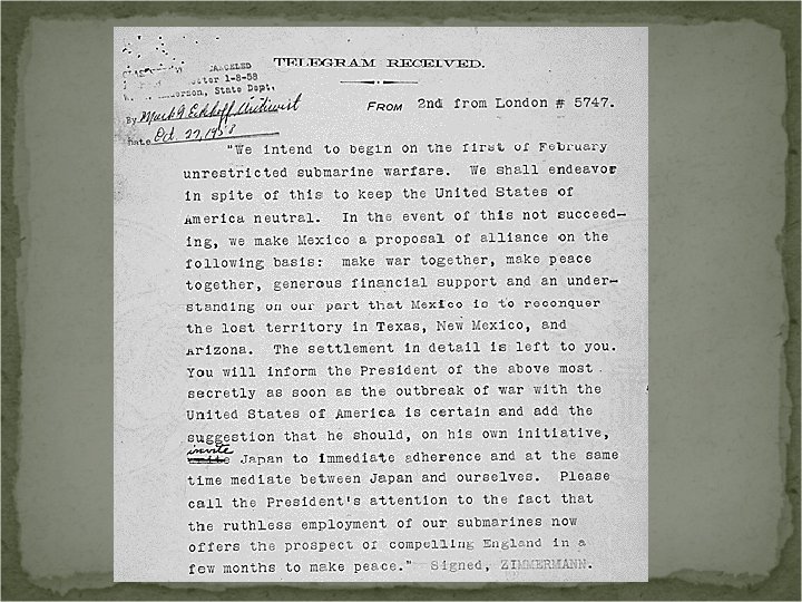 Moving Toward War Zimmermann telegram: – secret message from Germany to Mexico urging Mexico to attack the U. S. if the U. S. declared war on Germany – Germany promised to help Mexico regain land it lost to the U. S. in the Mexican War. * The U. S. declared war on the Central Powers in 1917.