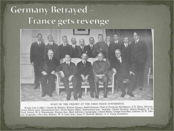 Germany is forced to sign the Treaty of Versailles, even though they provided no input Most angering was Article 231 – the War Guilt Clause – where Germany was forced to take the entire blame for the war This meant that they would be forced to pay for all damages from the war