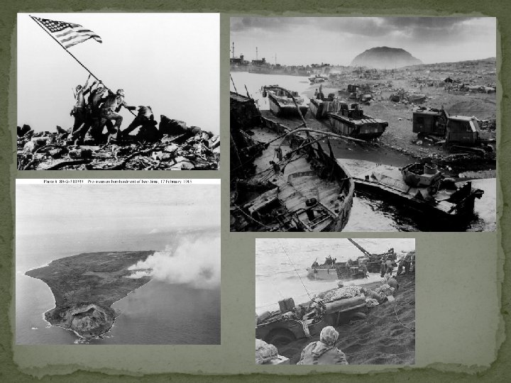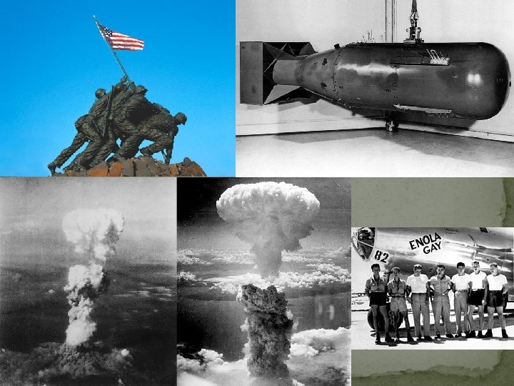 War With Japan �April 12, 1945: FDR dies of stroke in GA � Vice-President Harry S Truman sworn in as president �Bombing of Tokyo had been unsuccessful � U. S. needed closer airfields to accurately bomb Tokyo: �Island of Iwo Jima is perfect location �One of the hardest fought battles in the pacific “Uncommon valor was a common virtue”~ Admiral Nimitz �General Le May orders B-29 s to “firebomb” � Napalm firebombs controversial b/c of civilian casualties