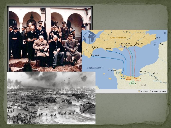 Allied Strategy �Strategic Bombing � Allied aircraft bomb industrial cities in Germany �Dresden, Leipzig, and Berlin—Dresden almost completely destroyed �Luftwaffe heavily damaged, no longer able to control skies �Bombings clear way for Allied invasion of Europe �German moral weakened, infrastructure destroyed � Allies crack “Enigma Code, ” better understand German plans � Massive invasion force built up in England over two years �The Tehran Conference: FDR wants to meet with Stalin, the two meet with Churchill in Tehran, Iran � U. S. & U. K. will attack France, U. S. S. R. will attack also � Stalin promise to help U. S. against Japan, after Germany � Post-war international peace keeping organization