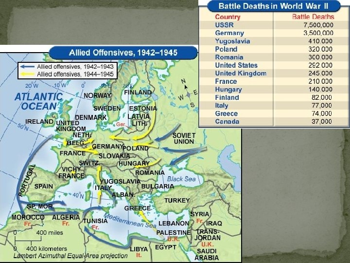 The Allied Invasion of Europe �“D-Day”: Operation Overlord � Germans expect invasion at Calais, narrowest strait �Allies reinforce misconception by placing Patton as decoy � June 5, 1944: Allied paratroopers dropped behind German lines to secure roads and bridges for push inland � June 6, 1944: Invasion of Normandy �Allied battleships and airplanes bombard German defenses �Mass armada of vessels land troops on five beaches Omaha, Utah, Gold, Sword, Juno beaches won with superior manpower, weapons Gen. Bradley leads U. S. First Army at Omaha, 2, 500 dead, but victorious �Inland progress is slow, Bradley and Patton push forward � August 25: Free French forces liberate Paris