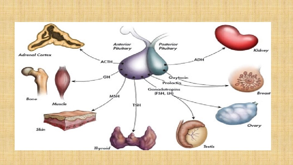 TSH – Thyroid Stimulating Hormone • Stimulates thyroid to produce T 3 and T 4 hormones which stimulate metabolism • Hypersecretion – rare, but can cause hyperthyroidism (see thyroid) • Hyposecretion – rare, but can cause hypothyroidism (see (thyroid) ACTH – Adrenocorticotropic Hormone • Stimulates adrenal gland to produce cortisol • Hypersecretion can result from both Addison’s and Cushing’s syndrome • Hyposecretion can result from Cushing’s syndrome