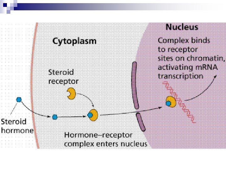 Hormone Effects n Hormone Receptors: Protein or glycoprotein molecules on target cells. ¨ Site of binding for hydrophobic hormones on the cell nucleus. ¨ Binding allows alterations in the gene expression of the cell, which triggers the receptor cell’s response. n Second-Messenger Systems: System for hormone binding for hydrophilic hormones. ¨ Causes the activation of enzyme molecules to catalyze the desired reaction.