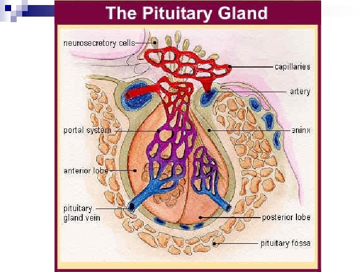 Endocrine Glands: Pituitary n Anterior Pituitary Gland: ¨ Made n n n up of. . Anterior Lobe Pars Tuberalis Hypothalamo-Hypophyseal Portal System: Allows blood to flow from capillaries in the hypothalamus into the portal veins of the anterior pituitary. ¨ Transports the inhibitory & releasing hormones from the hypothalamus to control the APG.