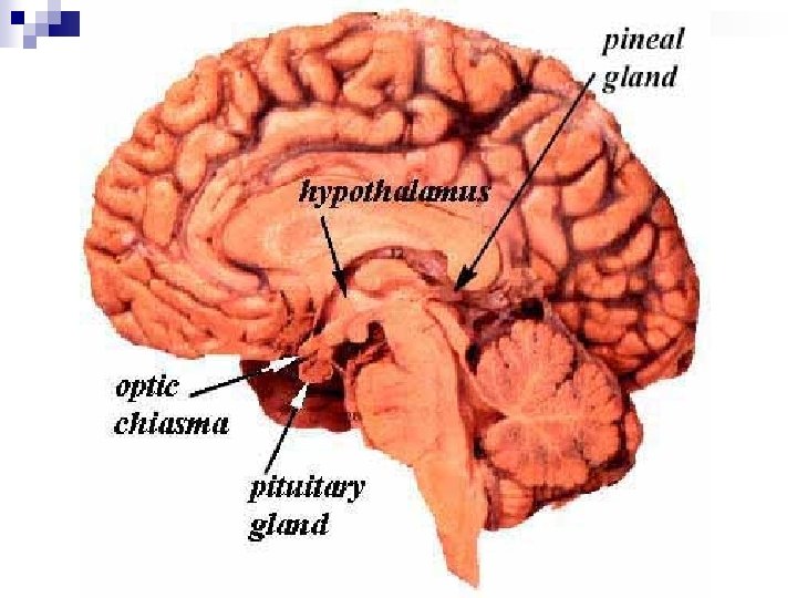 Endocrine Glands: Pineal n Pineal Gland: Mass of neural and secretory (pinealocytes) cells siitting on the roof of the brain’s 3 rd ventricle. ¨ Melatonin: Only hormone produced – acts as an antioxidant, regulates internal biological clock, circadian rhythms. n Production is INCREASED in darkness and DECREASED in bright light. ¨ Seasonal Affective Disorder (SAD): Depression triggered by overproduction of melatonin during the winter’s lack of natural light.