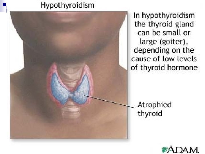 Thyroid Disorders Hypothyroidism: Lowered production of thyroid hormones. Can be passed down by the mother and result in stunted growth, low body temperature, and possible mental retardation. n Myxedema: Low metabolism, increased weight gain, & high blood pressure due to low levels of thyroid hormones. n