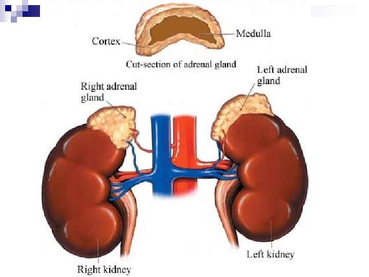Endocrine Glands: Adrenals n Adrenal Glands: Located on top of the kidneys. ¨ Adrenal n Zona Glomerulosa: Secrete mineralcorticoids to maintain homeostasis. ¨ n Cortex: Outer layer The enzyme renin to stimulate aldosterone (regulates sodium & potassium levels & controls blood pressure by increasing blood volume. ) Zona Fasciculata: Secretes glucorticoids to increase energy supplies, regulate metabolism, break down protein & tryglycerides, & help resist stress. ¨ Cortisol (90% of glucorticosteroid activity) is released in response to stress. Release controlled by the hypothalamus; increases metabolism, lowers inglammation, depresses immune response.