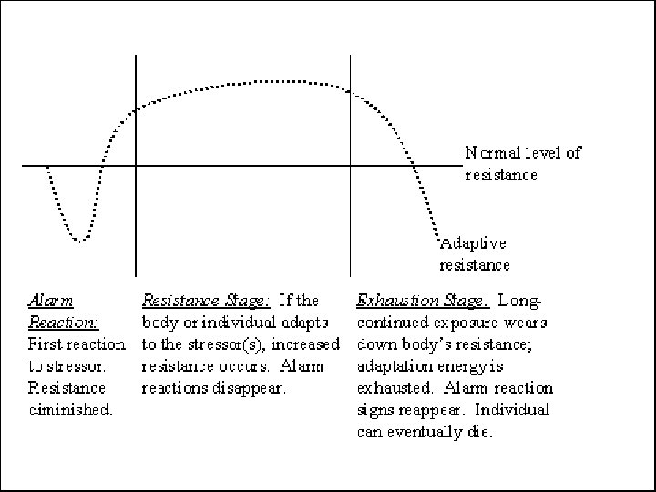 General Adaptation Syndrome n General Adaptation Syndrome: The three stages the body goes through in “fight or flight” mode or during times of stress. ¨ Alarm (Fight or Flight) Reaction: Norepinephrine and epinephrine are released to arouse the body. n Blood glucose, aldosterone, and angiotension levels increase. ¨ Resistance Reaction: If stress continues, cortisol is increased to break down fats & proteins to glucose for instant energy. ¨ Exhaustion: If the stress still continues, cortisol levels become too high and cause headache, ulcers, & immune compromise.