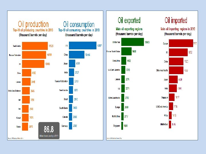 THE ENERGY SCENE Saudi Arabia, Russia and the United States are the 3 main producers, but only the US is among the top 3 consumers, along with China and Japan. Therefore, two thirds of the oil produced is for export. The main exporting regions are the Middle East, the Former Soviet Union, and West Africa. The main regions relying on foreign imports for their oil supply are Europe, China, and the United States. Although the US has recently reduced its imports with the local development of unconventional production.