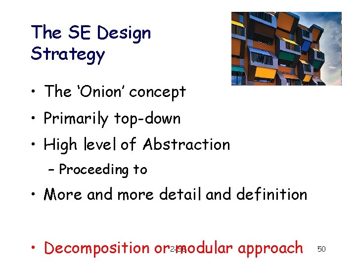 The SE Design Strategy • The ‘Onion’ concept • Primarily top-down • High level of Abstraction – Proceeding to • More and more detail and definition • Decomposition or 2 -SE modular approach 50