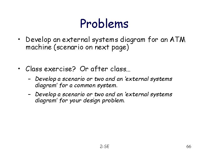 Problems • Develop an external systems diagram for an ATM machine (scenario on next page) • Class exercise? Or after class… – Develop a scenario or two and an ‘external systems diagram’ for a common system. – Develop a scenario or two and an ‘external systems diagram’ for your design problem. 2 -SE 66