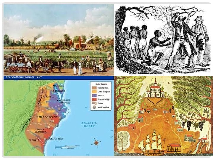 THE SOUTHERN COLONIES • Rich soil and almost year-round growing season were ideal for plantation crops like tobacco. • These type of crops required much labor to produce, so planters used enslaved Africans. • By 1750, there were over 235, 000 enslaved Africans in America, about 85% lived in the southern colonies • These large plantations were so self-sufficient, large cities and towns were rare. • Elite planter class developed and soon took control of political and economic power in the south.