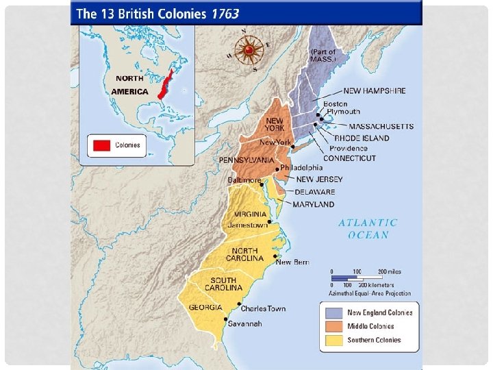 NEW ENGLAND COLONIES CONT… • Settlers mainly from England. • Long winters and rocky soil made farming difficult. Most farmers practiced subsistence farming, growing enough food for themselves with a little extra to trade in town. • Larger plots of land were sold to groups of people, usually Puritans, causing more towns to develop. • The Atlantic Ocean provided resources, such as seafood; the forests provided lumber. As a result wealth came from shipbuilding, fishing, and trade. • There were few slaves, mainly as house servants. • England passed the Navigation Acts in 1651 to obtain profits from colonial trade.